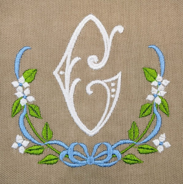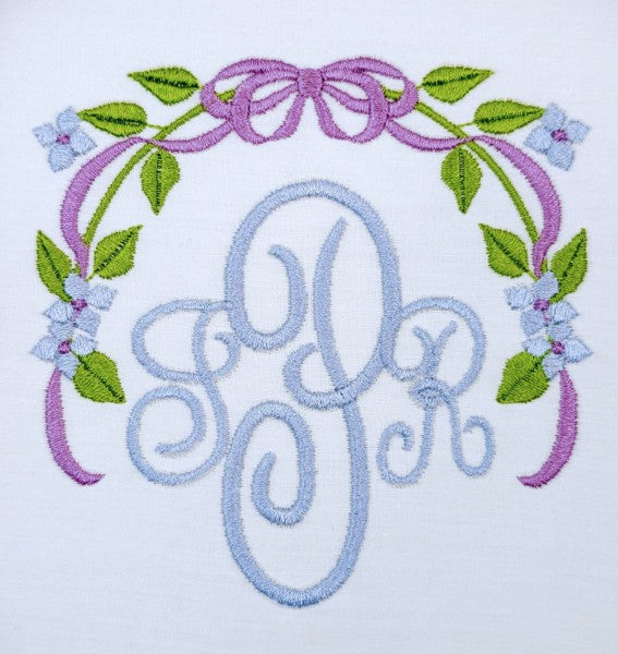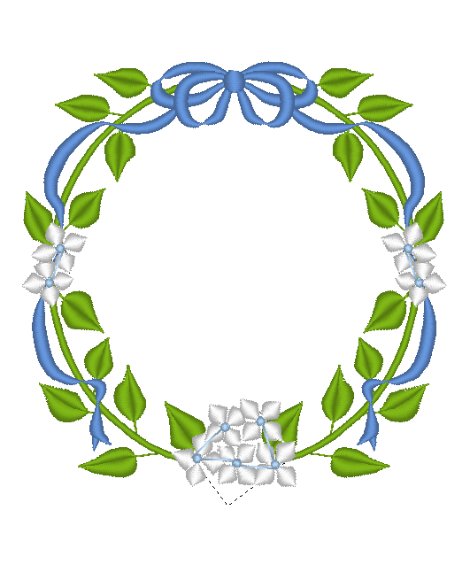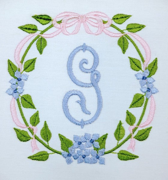 Beautiful hydrangeas form a wreath wrapped in ribbon in two sizes, a garland and three individual florets to add to your own designs. Try the garland flipped vertically – it's lovely as a monogram topper too. Note that because the flower centers are so tiny, I have intentionally inserted jump stitches between them. Fonts not included.